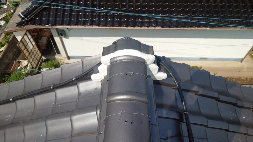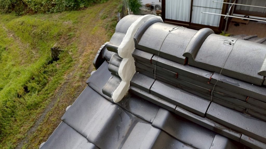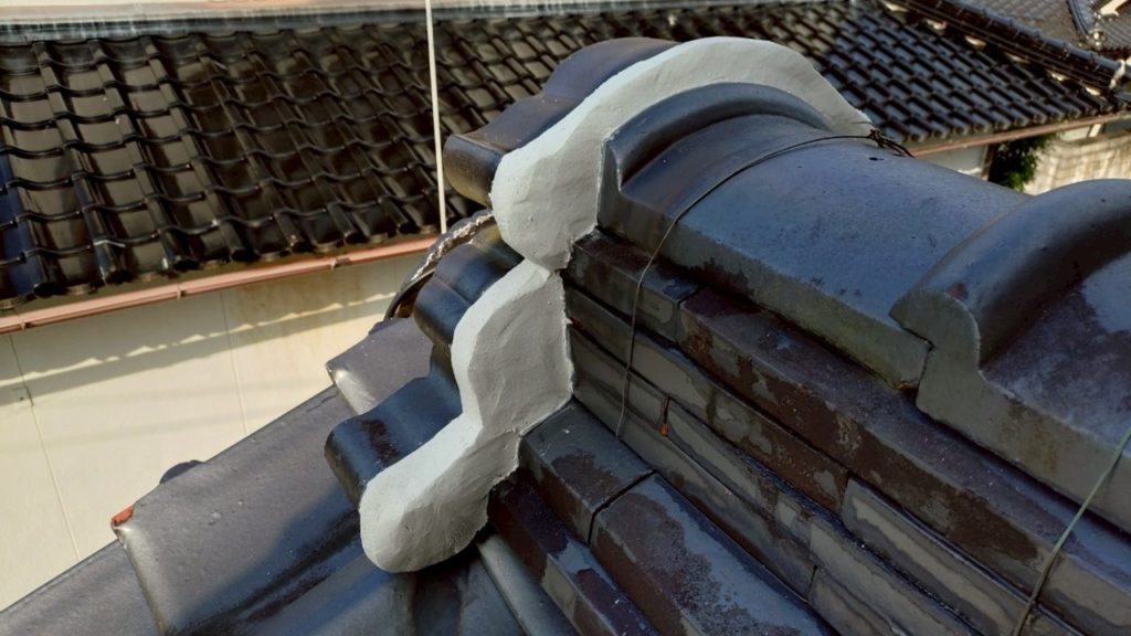 瓦の隙間が漆喰で塞がれました。これで、棟の内部に雨水が侵入することはありません。