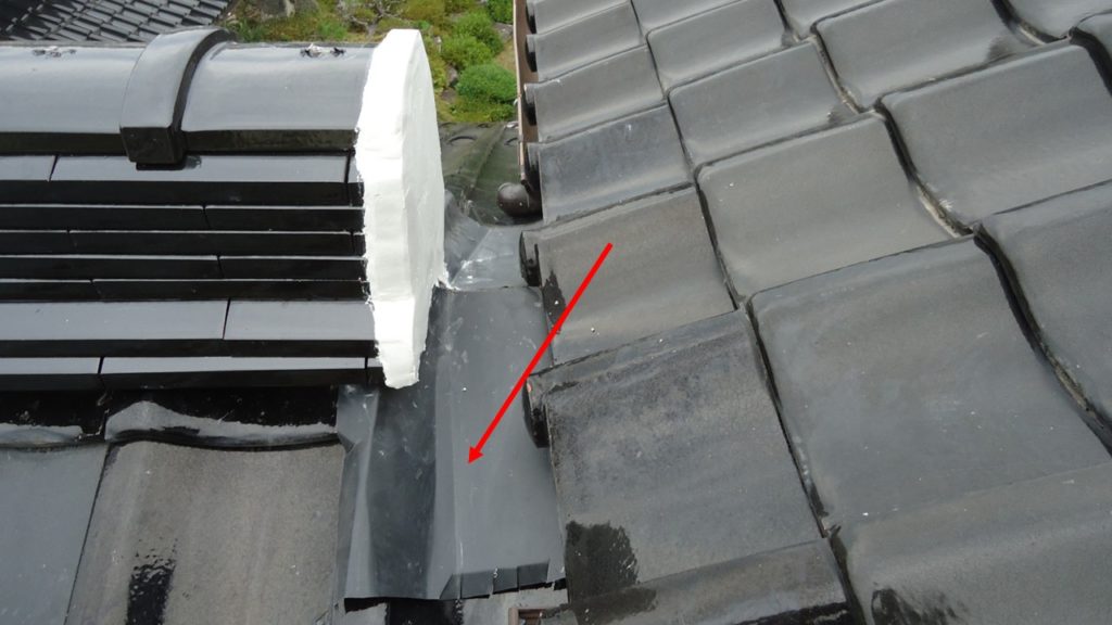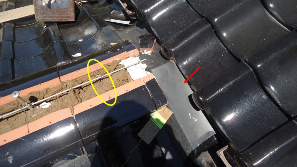 谷板金(赤い矢印)を撤去し、新しいステンレス製の谷板を取り付けます。雨水の流れを考慮し、勾配や重なりを調整して施工しています。(黄色の丸印はのし瓦の緊結状態です。)