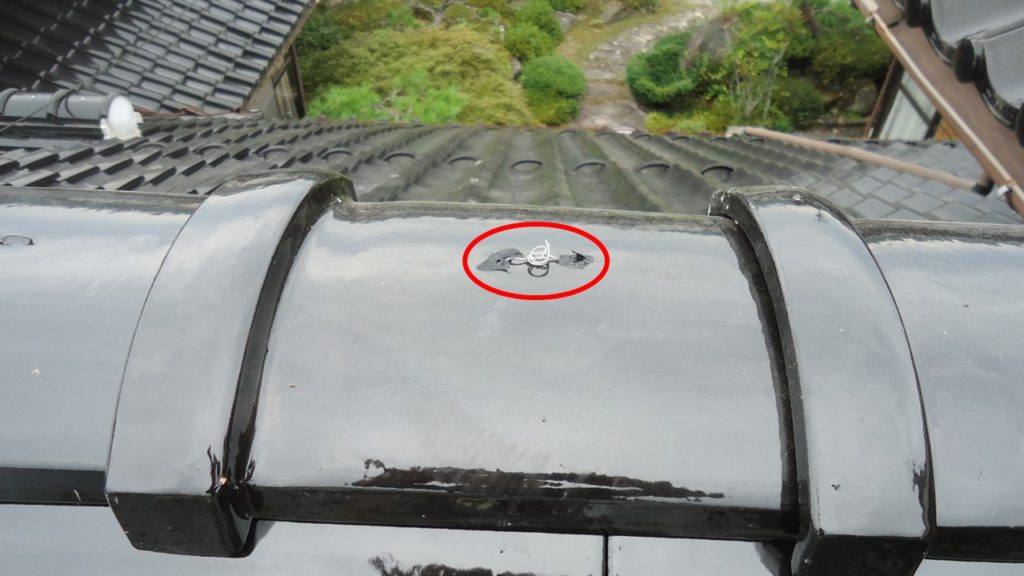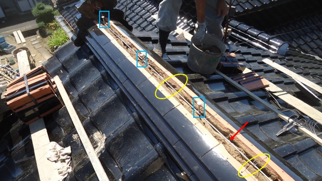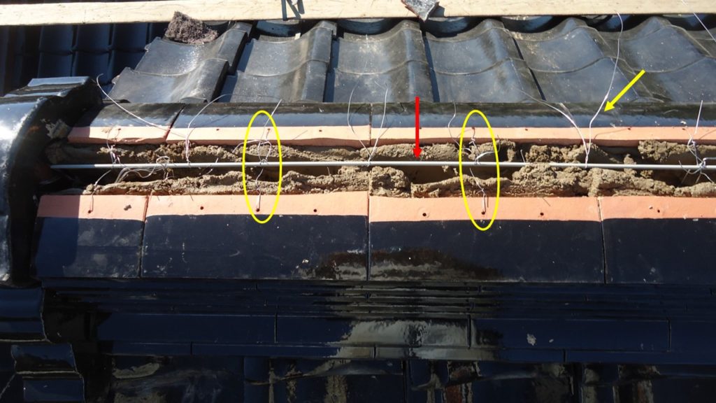 のし積み3段目と7段目の施工状況です。7段目までのしを積んで、最後に雁ぶり瓦を被せます。黄色の矢印の緊結線は、雁ぶり瓦を固定する為のもので、赤い丸印のように留付けていきます。雁ぶり瓦の穴はコーキングで塞ぎます。