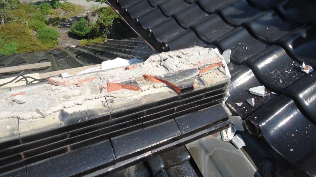 既存の棟瓦と土台を丁寧に取り外していきます。古い漆喰や土はすべて撤去し、清掃をしてから新しい棟を積んでいきます。棟の尾尻側にある谷板も交換します。