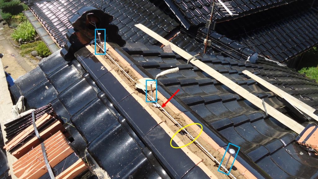 棟の安定性と耐震性を高めるため、のし積みには耐震ボルト(青い四角)と被覆鉄筋(赤い矢印)を組み込んだ構造を採用しています。耐震ボルトは屋根下地を貫通させ、棟芯にしっかり固定します。これにより棟全体が屋根構造と一体化し、地震時の揺れにも強い構造となります。のし積みの1・3・5・7段に耐震ボルトに沿って被覆鉄筋(防錆処理済み)を水平に配置し緊結。棟の内部を通し、そこにのし瓦を緊結(黄色の丸印)することによって、棟の崩れを防ぎ、長期的な安全性を確保します。のし瓦は、鉄筋と台土によって上下左右からしっかりと固定されます。鉄筋が芯材として機能することで、棟の直線性と強度が保たれます。