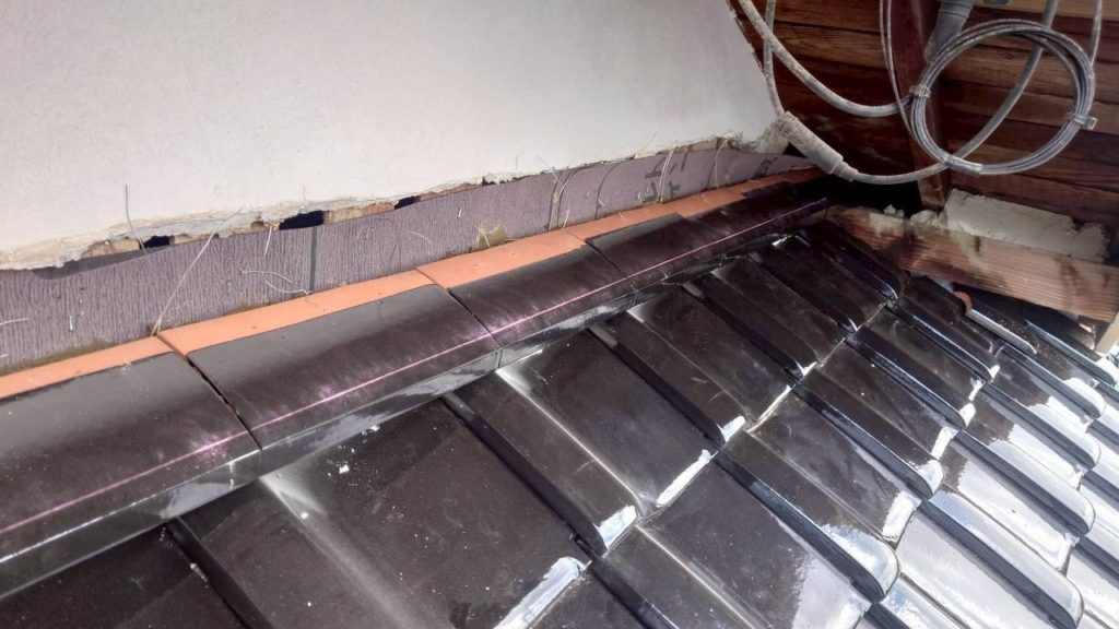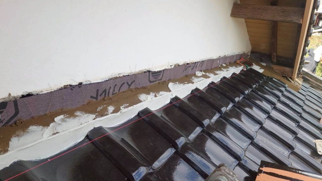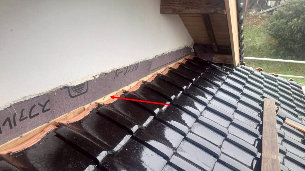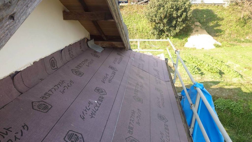 既存ののし瓦を撤去した後、まずは ルーフィングを壁際までしっかり立ち上げる処理 を行います。
