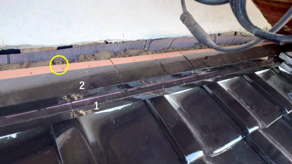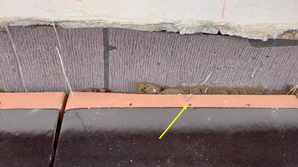 のし積み一段目で、緊結線を用いて瓦を固定している工程です。(黄色矢印)