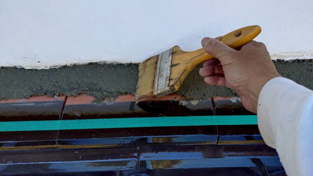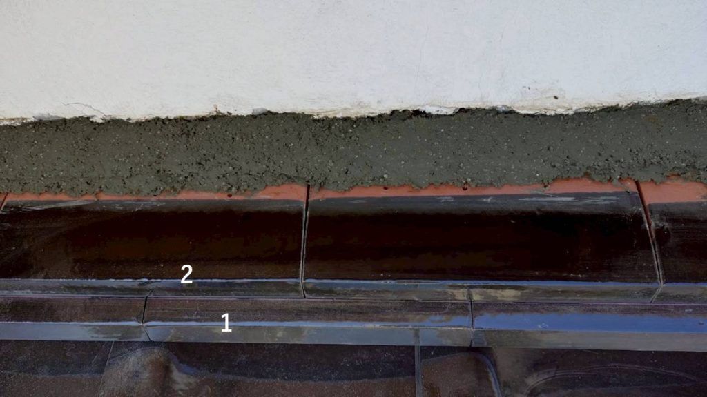 のし瓦2段積みの後、壁面との細かい隙間は 防水性の高いセメントでしっかりと埋め戻し を行います。