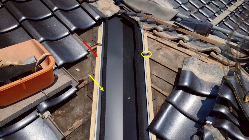 谷板の端には瓦が被せられるのですが、つりこで細かく固定することで、台風のような強風でも谷板が暴れることがなく、安心です。黄色の矢印のスポンジは、雨水の溢れを防ぐことはもちろん、小動物や、虫、枯葉などのゴミの侵入を防ぐために取り付けています。