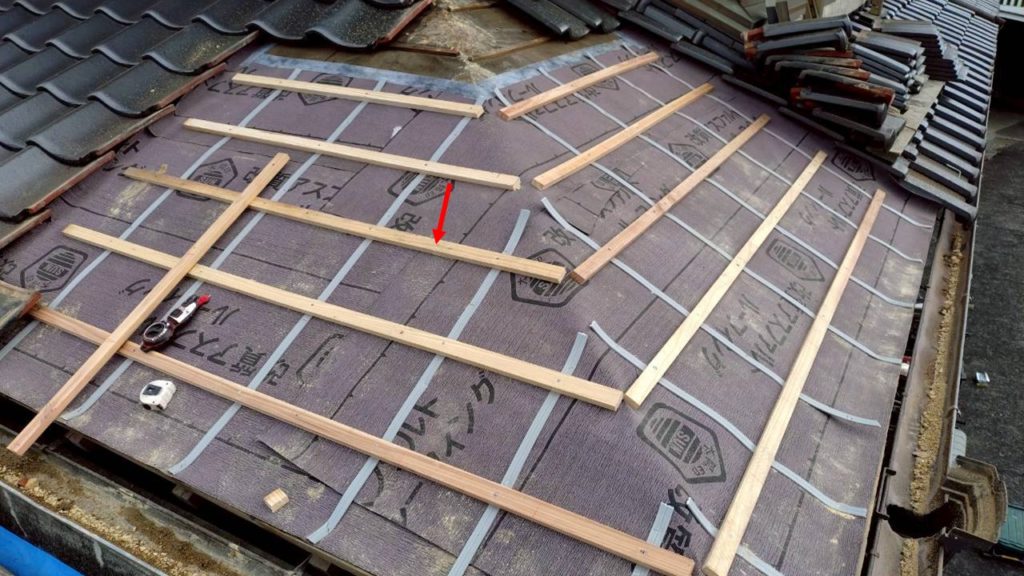 流水テープの上に桟木(赤矢印)を取付け、この桟木に瓦を固定します。