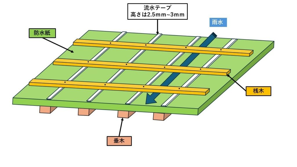 流水テープには、防水紙と桟木の間に隙間を作り、重なり部分に雨水が溜まることなくスムーズに下方向へ流す役割があります。流水テープによって屋根地の上の雨水の流れをコントロールし、雨漏りを防止します。
