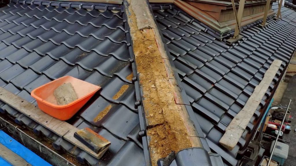 屋根の状態を正確に確認するため、既存の隅棟を解体します。