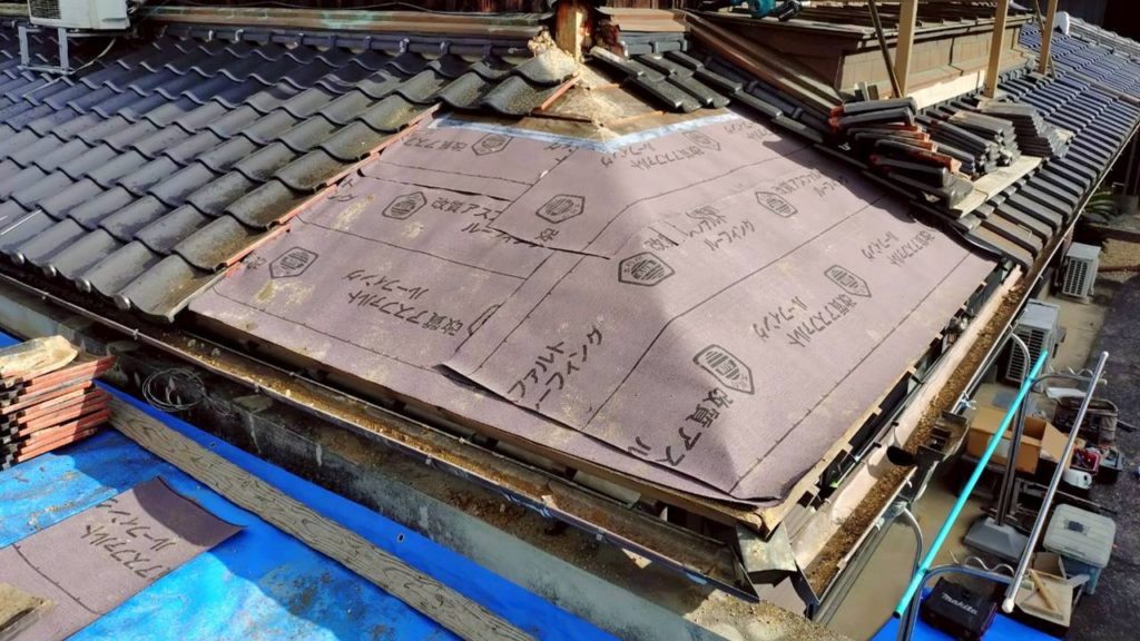 美作市 雨漏り修理|既存瓦を再利用した隅棟の積み替え工事と防水紙の張り増し