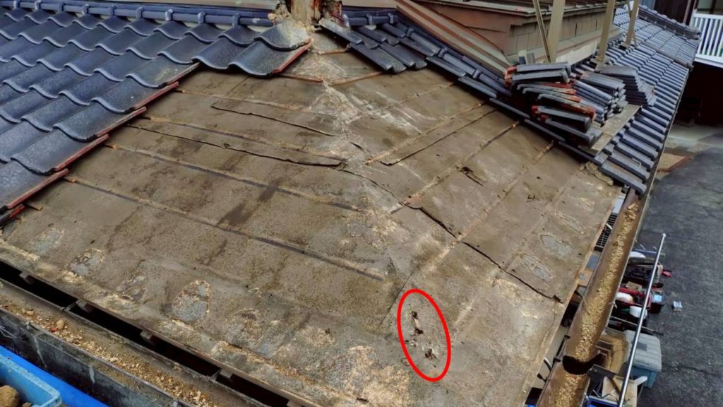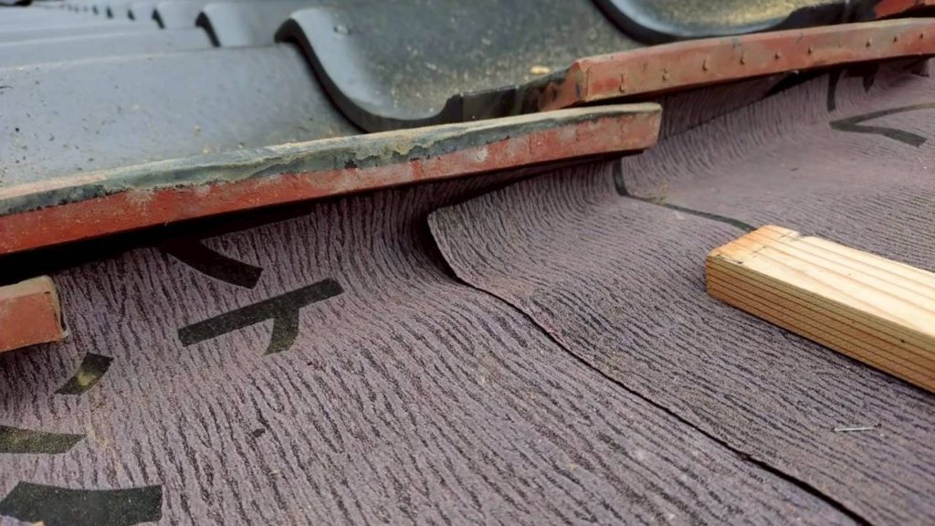 さらに、既存の防水紙(ルーフィング)を確認したところ、隅棟部分の防水紙に穴が開いていることが判明しました。この穴から雨水が侵入し、雨漏りにつながっていたと考えられます。