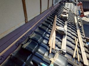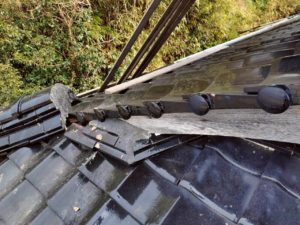既存の破風尻を解体して、破風板にのし瓦を緊結するステンレス線を取付けます。
