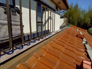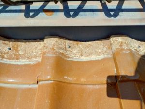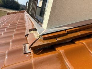 のし瓦がズレて隙間が発生しており、本来防がれるべき雨水が 壁際から侵入する恐れがあります。 特に吹き込みの雨では雨漏りリスクが高い状態でした。