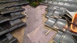 谷板を交換するために瓦を剥がし、古い板金を撤去すると、屋根地に張られた防水紙が出てきました。