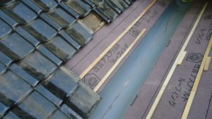 谷板の周りの軒瓦も一旦取り外し、防水紙は新しいものを張り直して雨仕舞しています。
