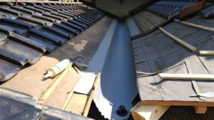 建物同士をつなぐ部分のにある谷部(屋根の溝)」の修理です。谷は雨水が集中する場所であり、枯葉などのごみも溜まりやすいと ろです。この機に合わせて交換を行いました。